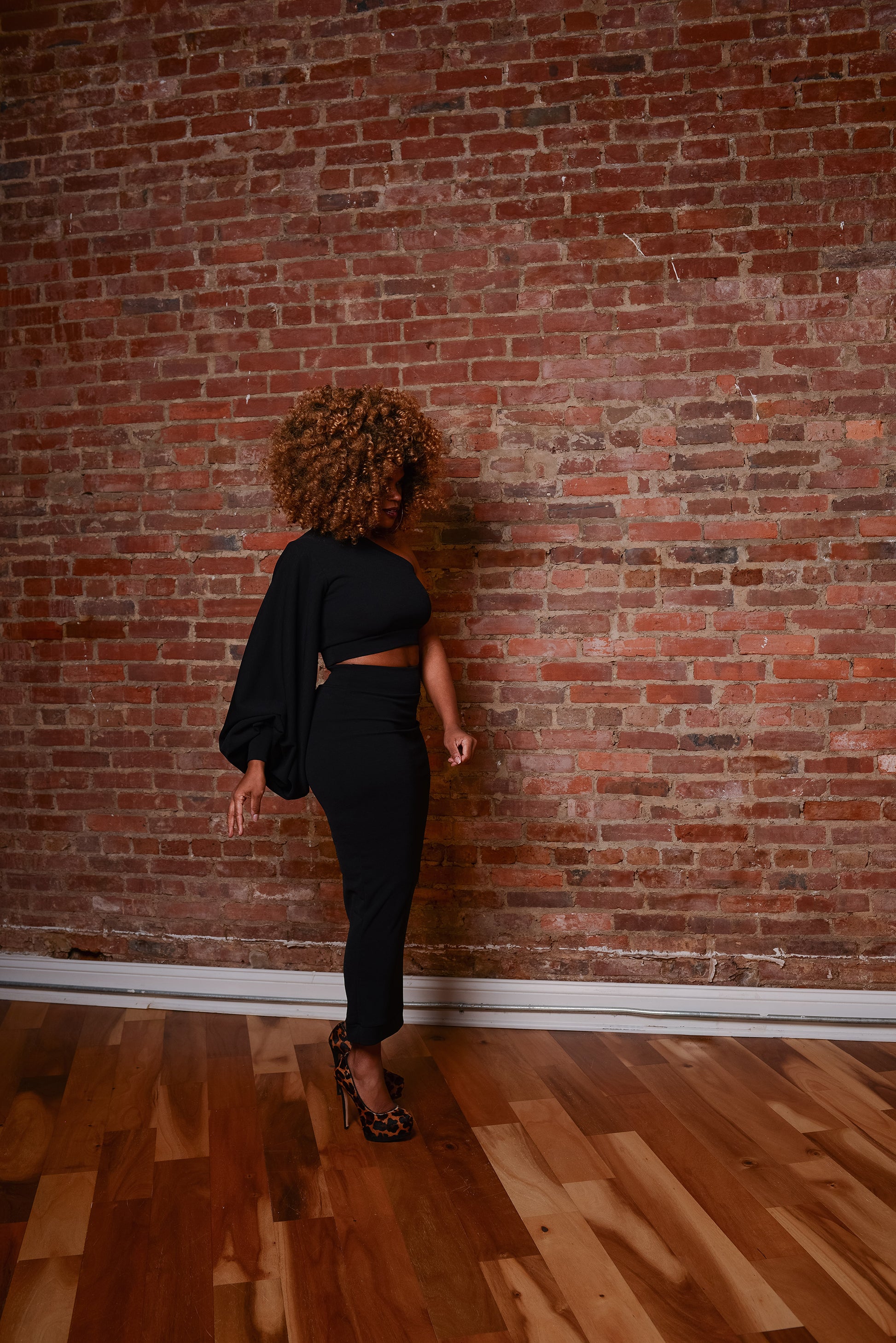 bishop sleeve one-shoulder crop + pencil skirt